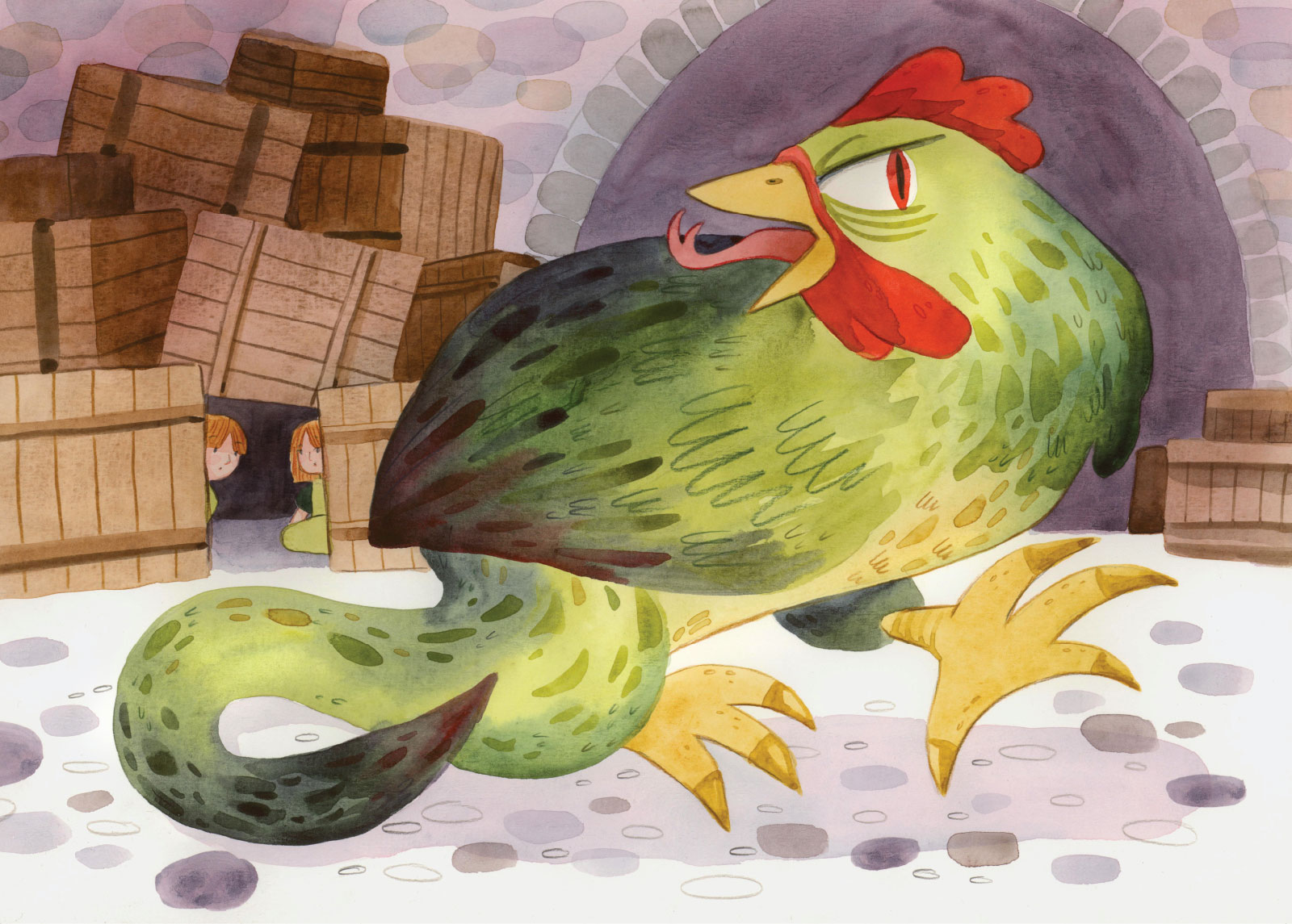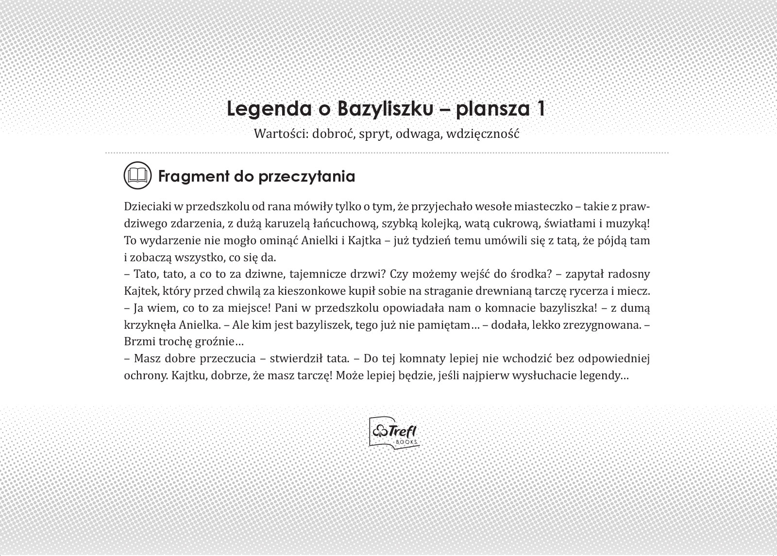 Kajtek i Anielka od rana skaczą z radości, bo do miasta przyjechało wesołe miasteczko – i to takie z prawdziwego zdarzenia, z karuzelą i gabinetem luster. A może to wcale nie pomieszczenie z tysiącem luster, tylko pełna tajemnic komnata, z klamką przypominającą trochę jaszczurkę, trochę koguta? Anielka przypomina sobie, że to może być komnata Bazyliszka, o której mówiła pani w przedszkolu. Zanim więc otworzą drzwi, tata postanawia opowiedzieć dzieciom pewną legendę.