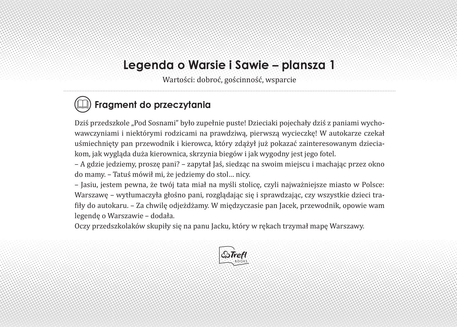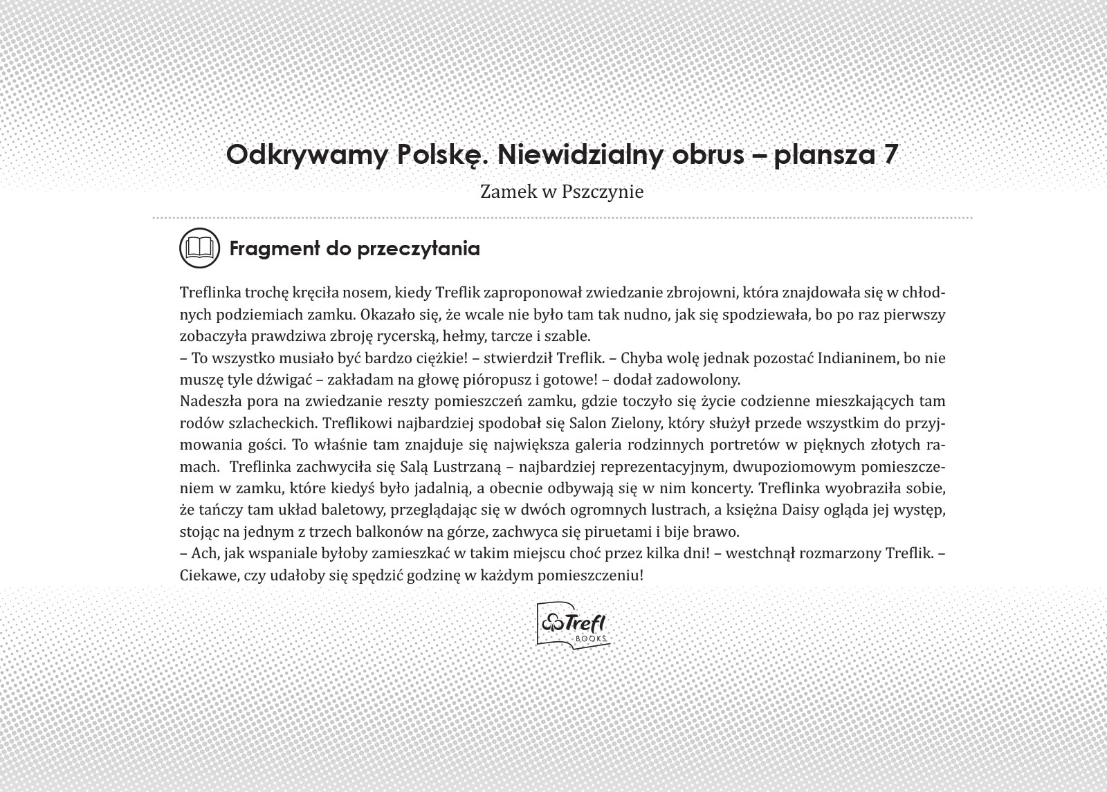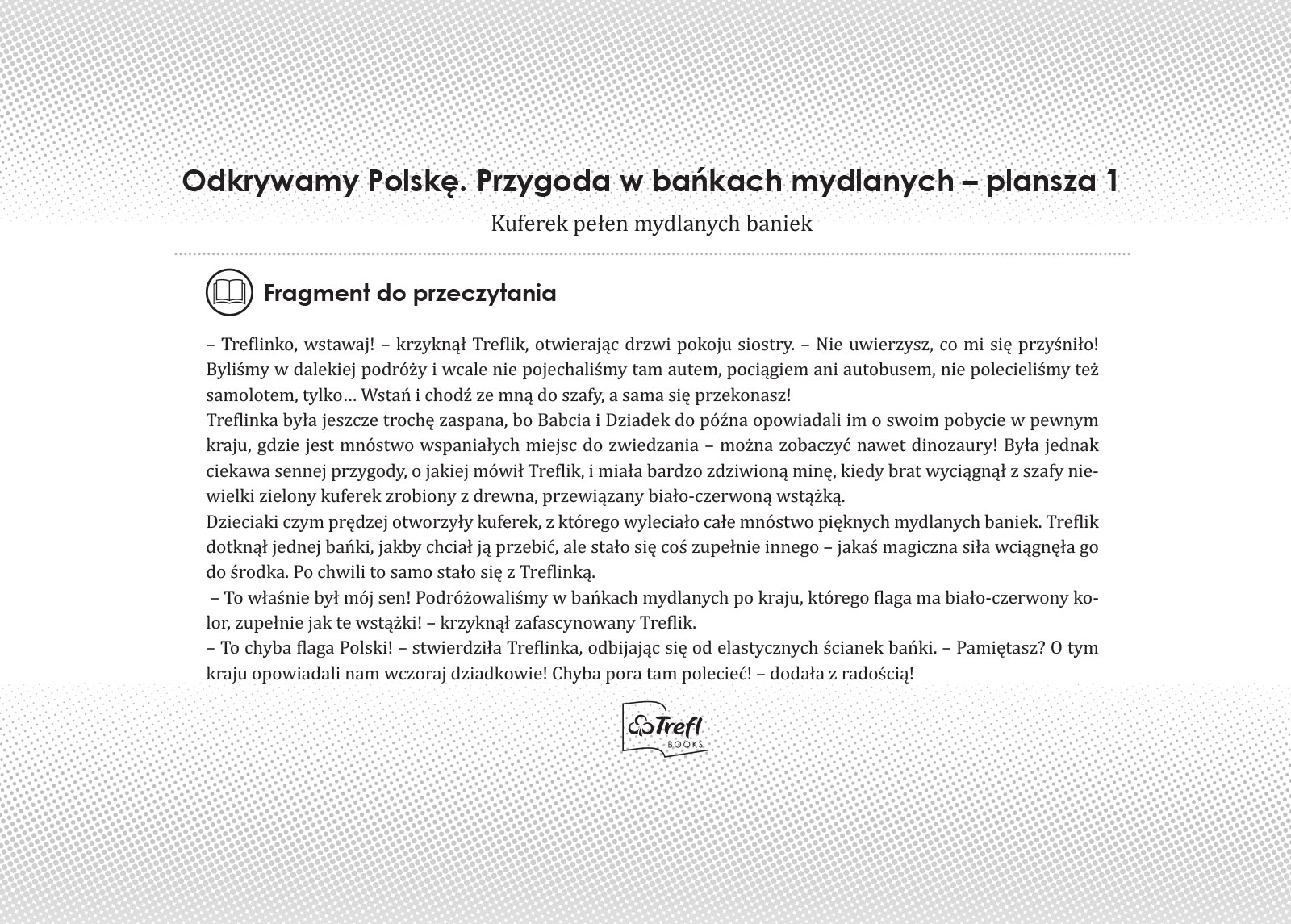 To pełna przygód podróż po naszym kraju z bohaterami bajki Trefliki. Plansze w formie ilustrowanego przewodnika zachęcają dzieci do odkrywania słynnych miejsc, takich jak Wawel czy Puszcza Białowieska oraz mniej popularnych atrakcji, np. Fokarium w Helu czy chatka Baby Jagi. Barwna fabuła przeplata się z ciekawostkami i informacjami, tworząc atrakcyjną opowieść o naszym kraju. Rozwija wyobraźnię i pokazuje, że poznawanie Polski może być fascynującą zabawą.