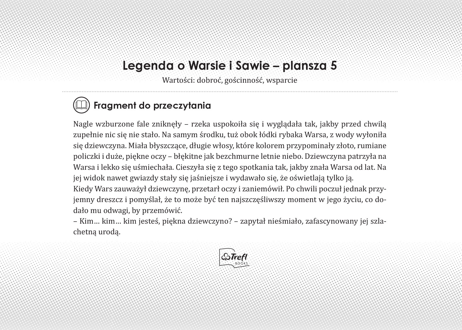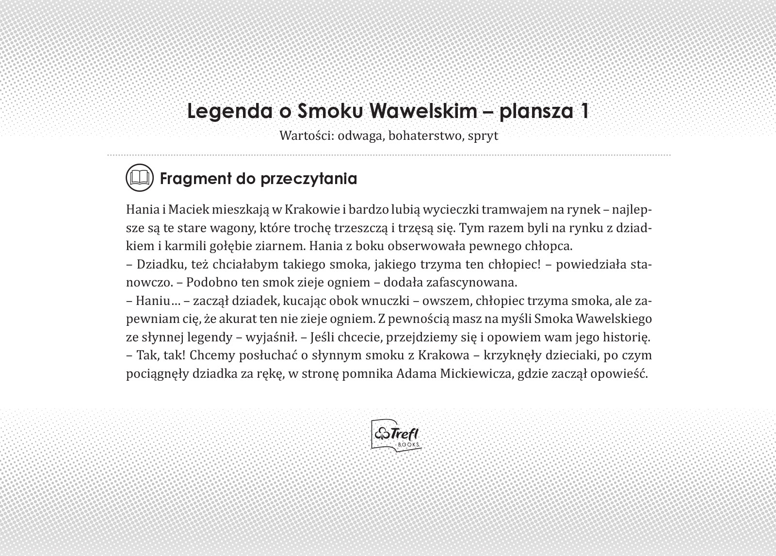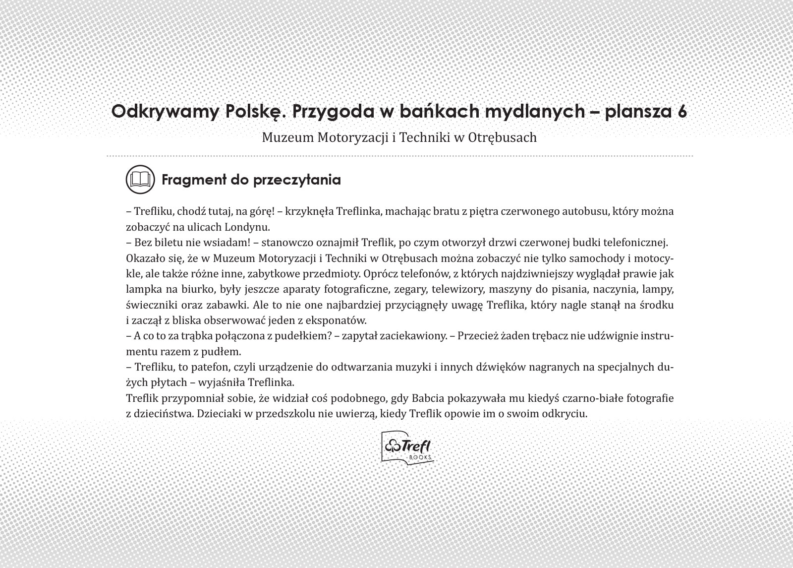 To pełna przygód podróż po naszym kraju z bohaterami bajki Trefliki. Plansze w formie ilustrowanego przewodnika zachęcają dzieci do odkrywania słynnych miejsc, takich jak Wawel czy Puszcza Białowieska oraz mniej popularnych atrakcji, np. Fokarium w Helu czy chatka Baby Jagi. Barwna fabuła przeplata się z ciekawostkami i informacjami, tworząc atrakcyjną opowieść o naszym kraju. Rozwija wyobraźnię i pokazuje, że poznawanie Polski może być fascynującą zabawą.