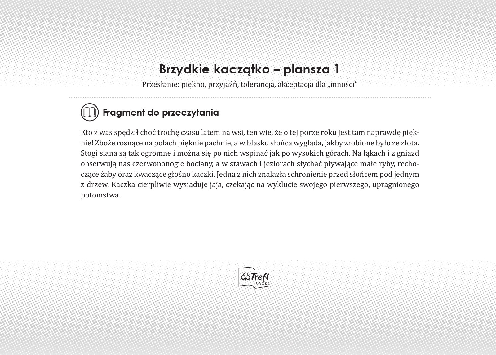 Ach, jak wspaniale czuła się pani kaczka, gdy wygrzewając się w słońcu, wśród pięknej zieleni, wysiadywała jaja, czekając na swoje pierwsze potomstwo. Kiedy większość skorupek pękła, a malutkie kaczuszki ujrzały świat, mama przywitała je z wielką miłością. Jedno kaczątko wyglądało jednak trochę inaczej i wciąż słyszało od innych, że jest brzydkie i nigdzie nie pasuje. Pewnego dnia zupełnie przypadkiem dostrzegło w wodzie swoje własne odbicie. Od tej chwili wszystko zmieniło się na lepsze. Z tej bajki przedszkolaki dowiedzą się też najważniejszego – że każdy jest piękny taki, jaki jest, i wcale nie musi pasować do innych.
