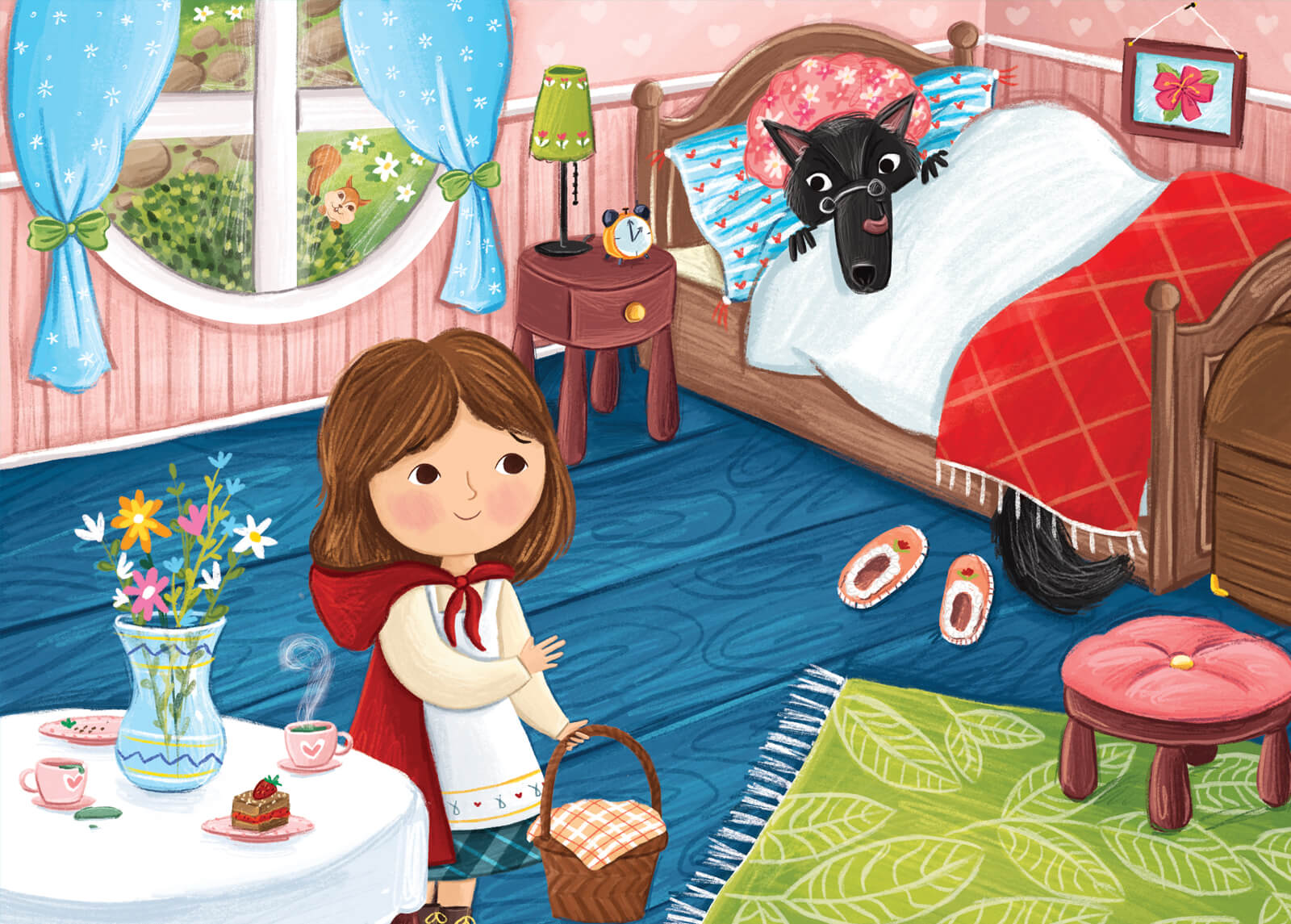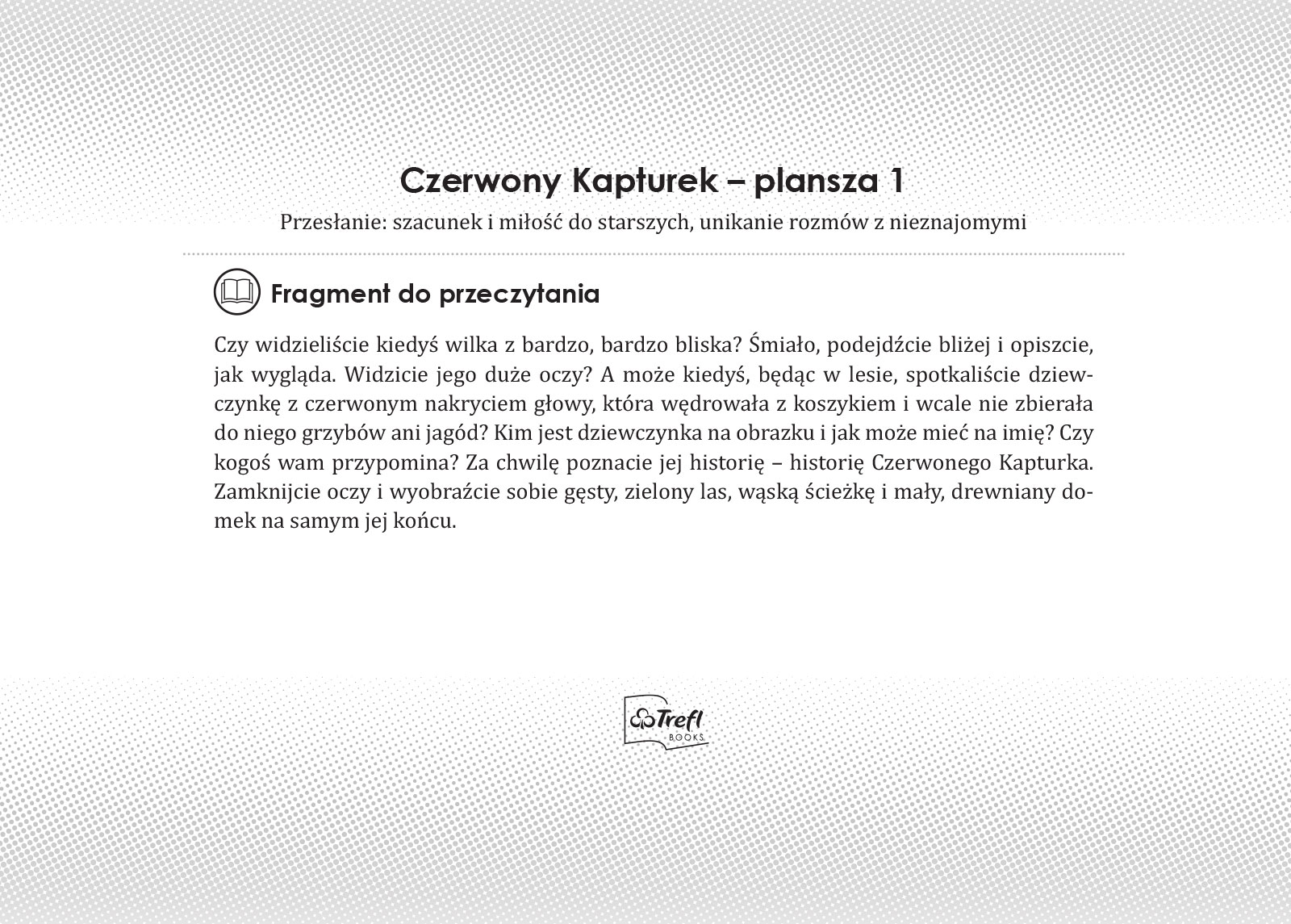 A kto tak pędzi przez gęsty, zielony las? To Czerwony Kapturek, który ma ważne zadanie – musi dostarczyć sok z malin, miód, owoce i smakołyki ukochanej, chorej babci, by wyzdrowiała jak najszybciej. Kogo spotkał Czerwony Kapturek i co stało się, gdy dotarł z koszyczkiem do babci? Tego przedszkolaki dowiedzą się, słuchając opowieści i śledząc każdy szczegół na obrazkach. Jedno jest pewne – dzięki bajce zrozumieją, że bez opieki dorosłych nie warto rozmawiać z nieznajomymi.