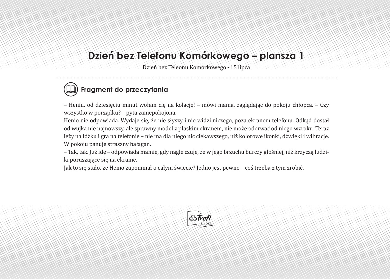 Nikt z rodziny, mama, tata, siostra, a nawet pies od kilku dni nie mógł poznać Henia. Chłopiec zachowywał się inaczej niż zwykle – nie zwracał uwagi na innych, nie odpowiadał na pytania, bo godzinami patrzył tylko na ekran telefonu komórkowego. Henio zapomniał nawet o tym, jak miło można spędzać wakacje! Pewnego dnia, rodzice zorganizowali wyjazd do dziadka, na wieś. Wszystko działo się tak szybko, że Henio zapomniał telefonu! Jak poradził sobie bez niego? Czy chłopiec przypomniał sobie, że istnieją rzeczy o wiele ważniejsze i bardziej przyjemne niż gra na telefonie? Opowieść o tym, że w rodzinie tkwi prawdziwa siła.