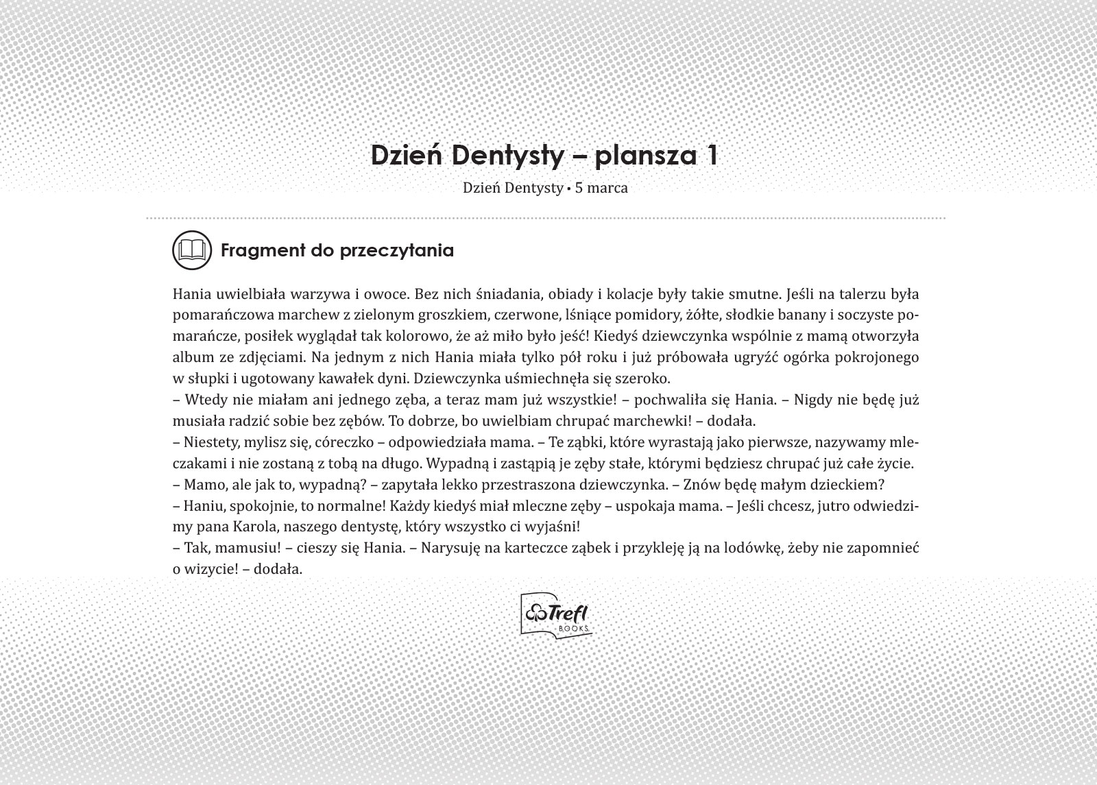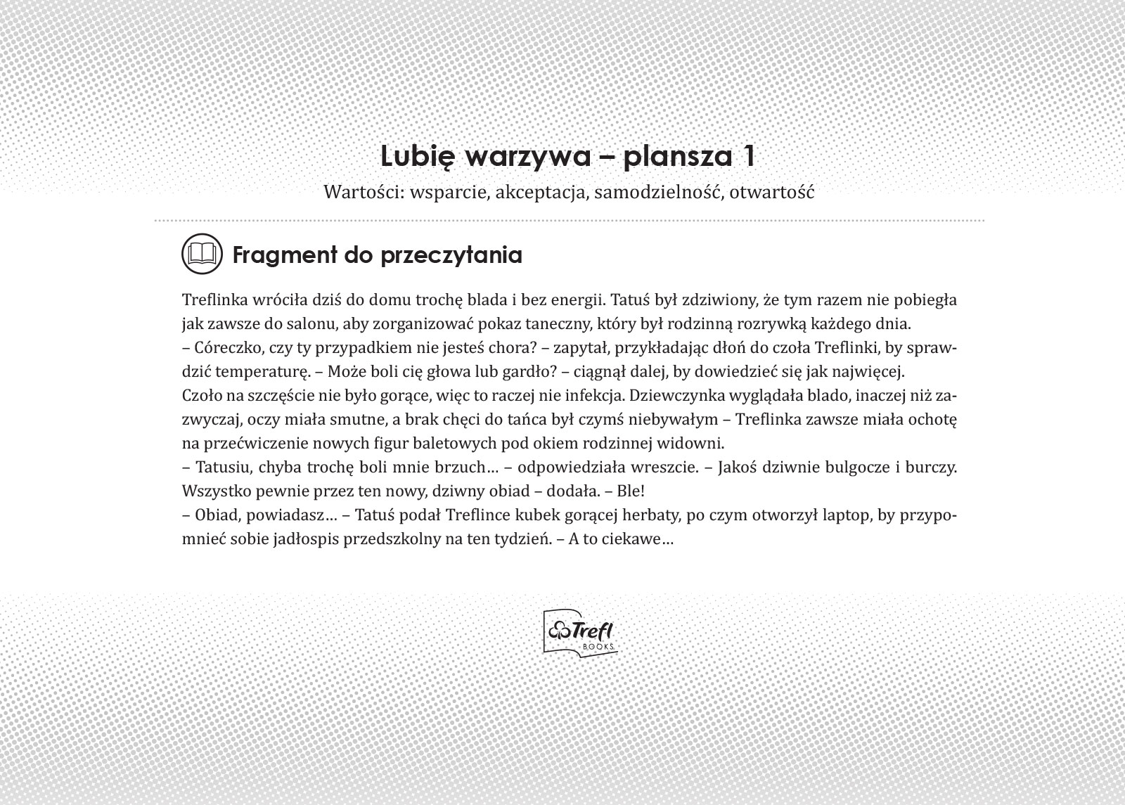 Treflinka po powrocie z przedszkola narzeka na ból brzucha i ciągle powtarza, że nie lubi warzyw, co bardzo dziwi Tatusia. Wszystko za sprawą brokułów w zupie, w dodatku tak ostrych, że nie można było ich przełknąć. Wydawało się, że Treflinka zniechęci się do warzyw na dobre. Na szczęście wizyta w warzywniaku Pod Brukselką zmieniła wszystko, a pani sprzedawczyni pomogła dziewczynce znaleźć prawdziwego winowajcę ostrej zupy.