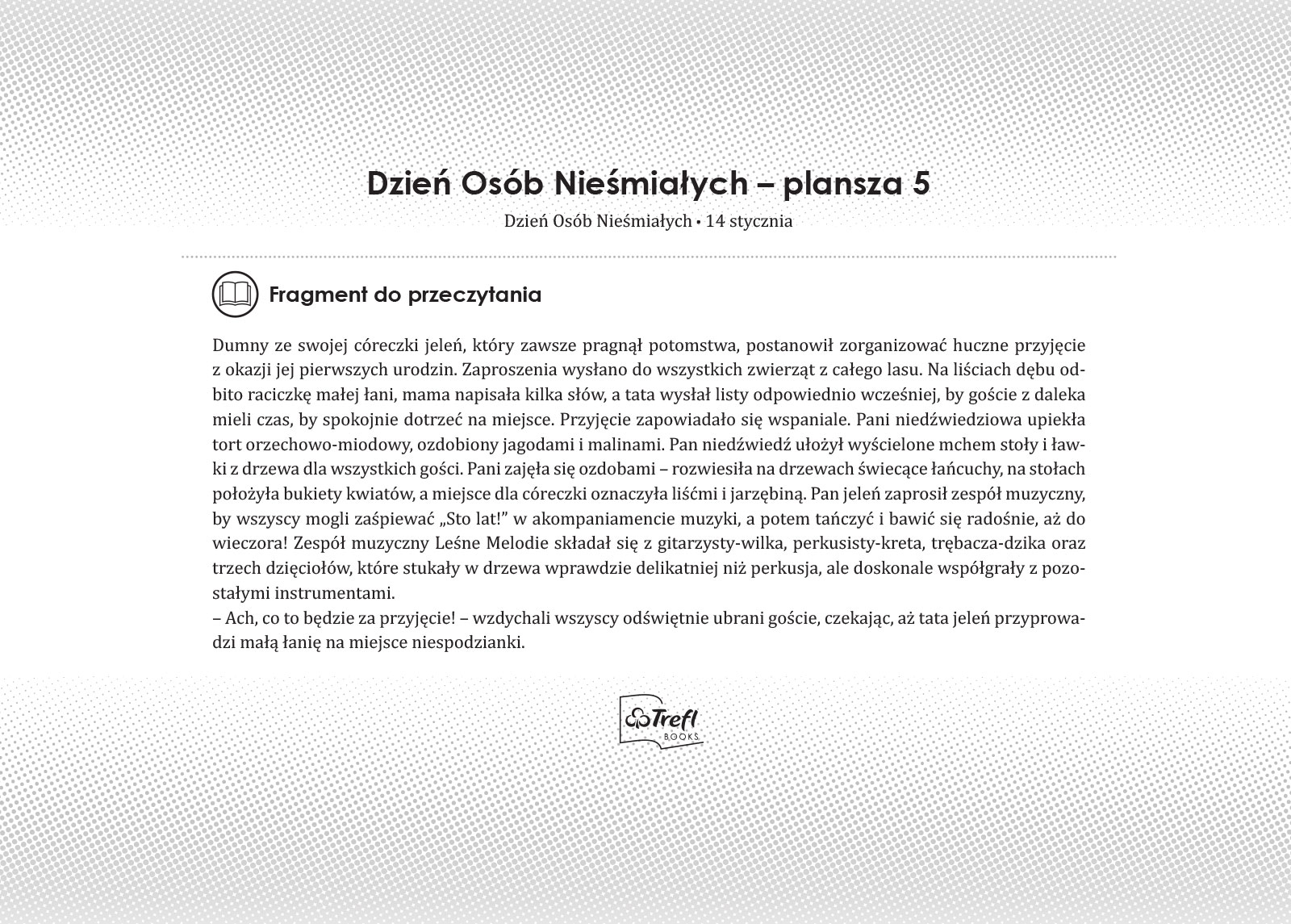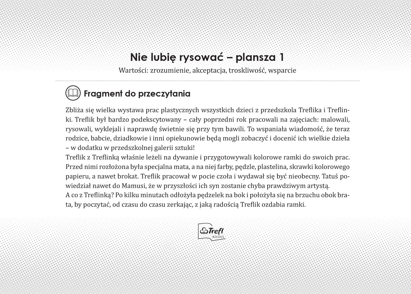 W przedszkolu Treflików szykuje się wielka wystawa prac artystycznych! Dzieci od tygodni rysują, malują i wyklejają, by jak najlepiej wypaść przed wyjątkowymi gośćmi. Jest jednak ktoś, kto wcale nie cieszy się na myśl o wielkim wydarzeniu. To Treflinka – nie lubi rysować i boi się, że zostanie źle oceniona. Na szczęście rodzic, brat i panie nauczycielki pomagają jej odnaleźć zajęcie, w którym czuje się świetnie.