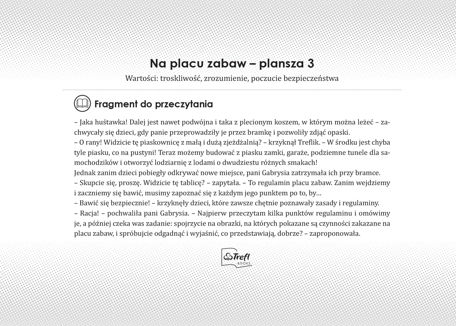 Razem z Treflikami wejdź do świata przedszkola, pełnego zabawy, przygód i emocji – nawet tych trudnych! To ciepłe opowieści o problemach i sytuacjach, z którymi często mierzą się przedszkolaki, np. kłótnia z przyjacielem czy strach przed krytyką. Bohaterowie pokazują, że w grupie zawsze można liczyć na wsparcie i przyjaźń, a trudne chwile kończą się uśmiechem. Opowiadane tu historie kształtują pozytywne zachowania i zdrowe nawyki. Dają dzieciom wparcie i zrozumienie. Uczą samodzielności, tolerancji i otwartości na innych. Pomagają zrozumieć, że wszystkie emocje są ważne i warto o nich rozmawiać.